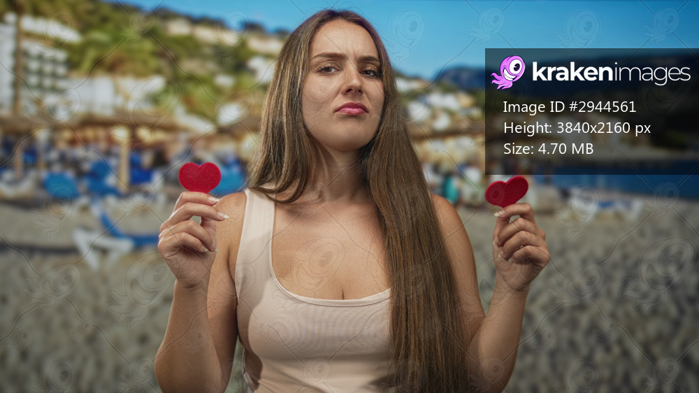 Woman with visible cleavage holds two red heart props at beach, lips pouting and eyebrows knit in skeptical expression; heartbreak doubt.