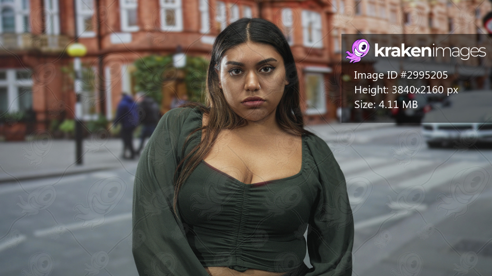 Woman with visible cleavage looking down on a city street crosswalk, hands clasped at waist and subtle shoulder slump; pensive.