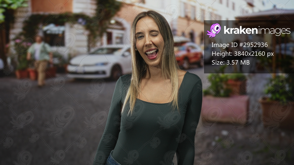 Woman with visible face and blonde hair winking and sticking tongue out while wearing a green scoop neck top on a cobblestone street; playful youthful fun. - Kraken Images