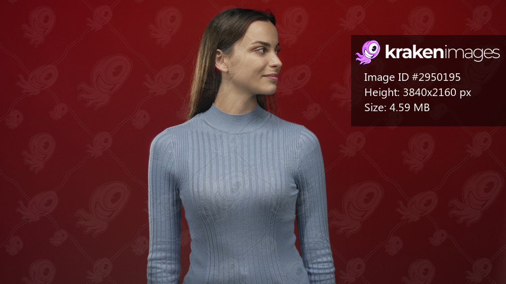 Woman with visible face and slight smile, wearing blue sweater and looking to the side in red studio; calm confidence.