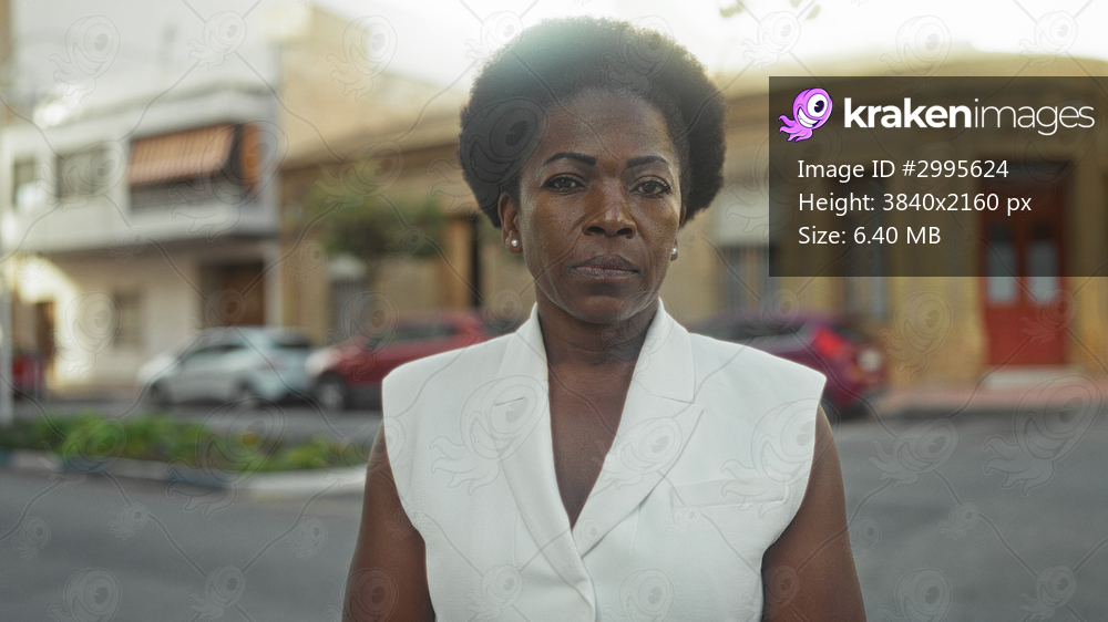 Woman with visible face standing and looking forward on a street in front of brick buildings, wearing sleeveless white vest; contemplation.