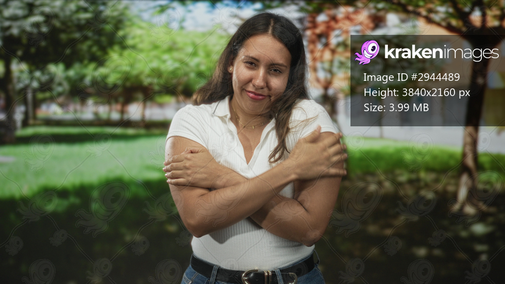 Woman with visible forearms claps hands in a forest clearing under leafy trees and green lawn, wearing white shirt and jeans; comfort.
