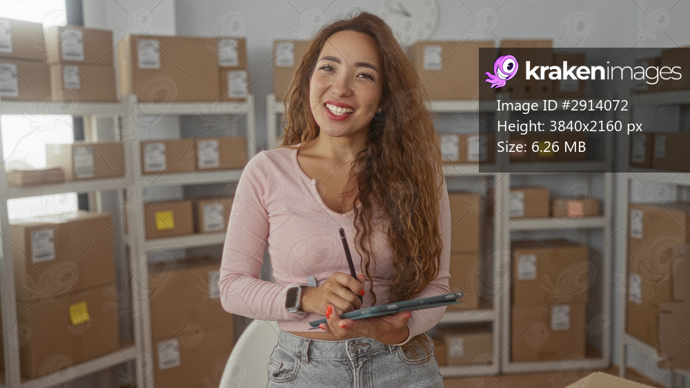 Woman with visible hands tapping tablet with stylus, smiling while checking parcels on shelves in building; small business confidence.