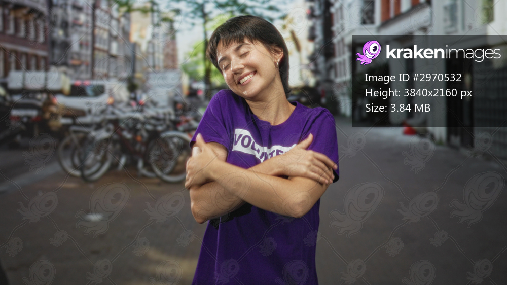 Woman volunteer with arms crossed showing bare forearms wearing purple shirt on street with parked bicycles; warm contentment.