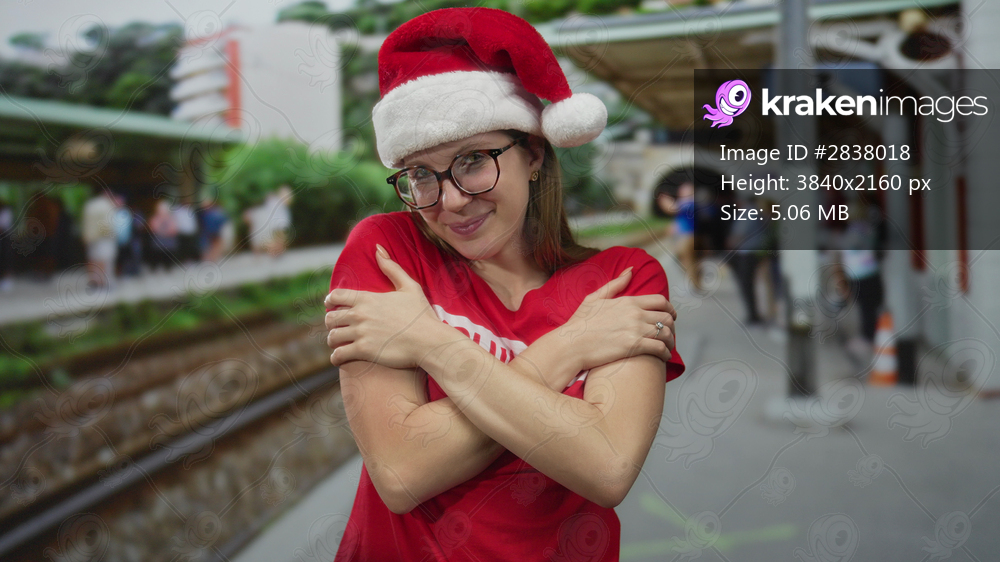 Woman volunteer with blonde hair and glasses wearing red shirt and santahat spreads arms at train station platform; joy.