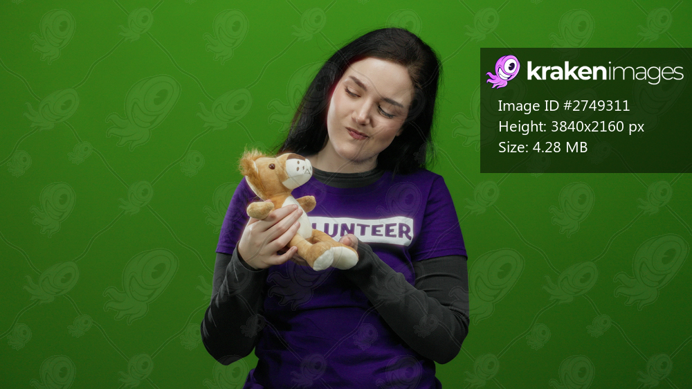 Woman volunteer with brunette hair holding stuffed toy against green background wearing purple shirt symbolizing compassion and community service.