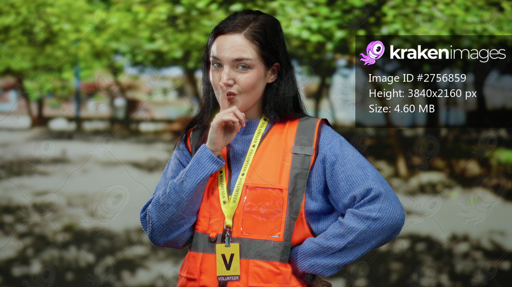 Woman volunteer with brunette hair makes a shushing gesture in a vibrant park, wearing a bright vest outdoors amidst lush green trees.