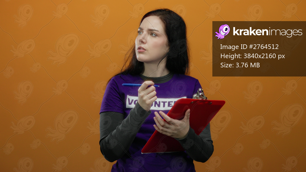 Woman volunteer with brunette hair writing on clipboard with pen against vibrant orange background in thought-provoking expression wearing purple shirt. - Kraken Images
