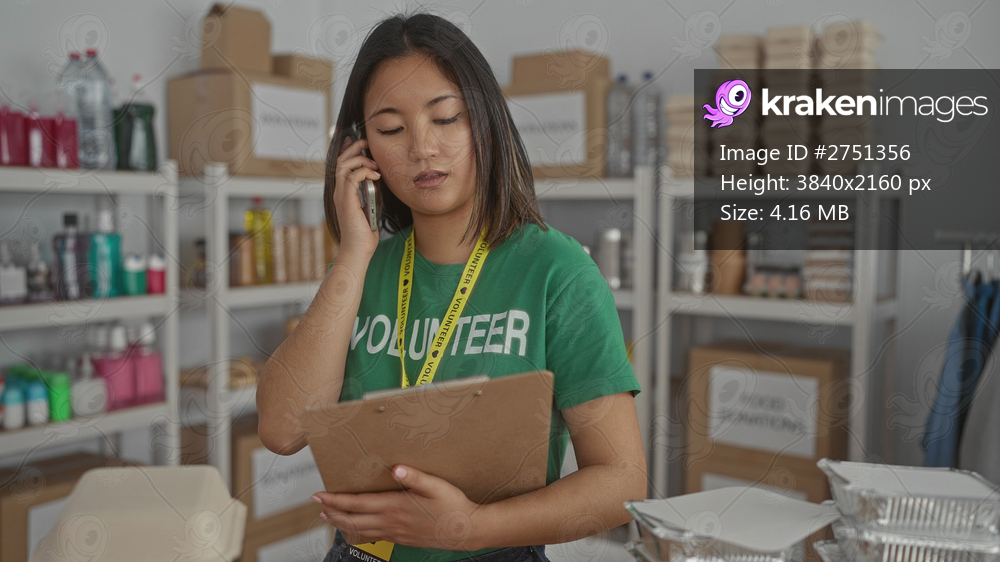 Woman volunteer with clipboard talking on phone in donation center surrounded by boxes and supplies wearing green shirt and yellow lanyard indicating organized indoor effort. - Kraken Images