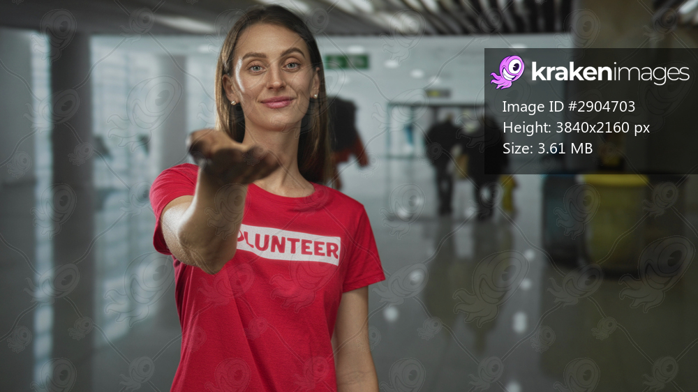 Woman volunteer extends hand palm up in airport terminal wearing red tshirt offering assistance; compassion support.