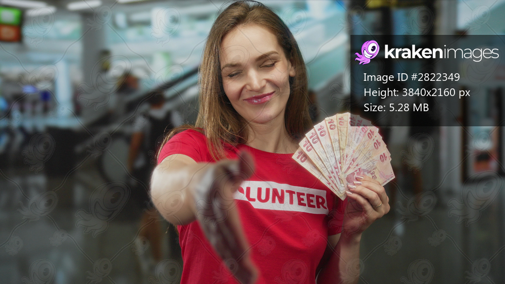 Woman volunteer extends hand to camera while holding fan of turkish lira banknotes in busy airport terminal; generosity.