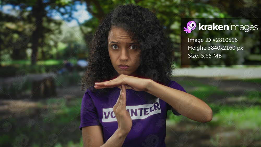 Woman volunteer gestures time out in a park surrounded by green trees wearing a purple shirt outdoors under natural light.