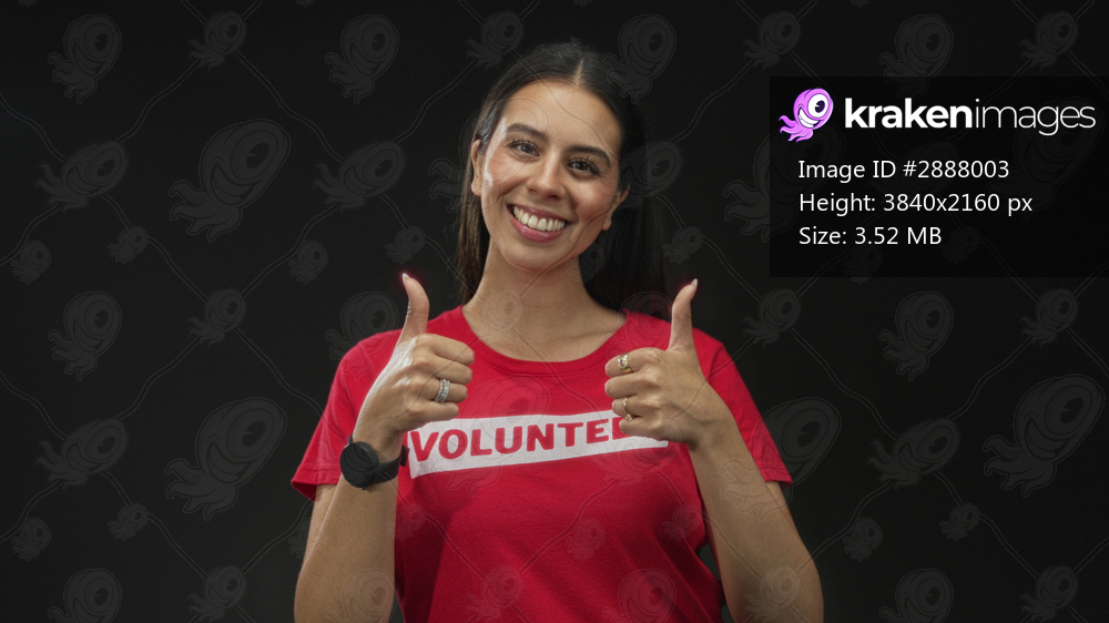 Woman volunteer giving double thumbs up in studio against a black backdrop, wearing red volunteer shirt; optimism community support.