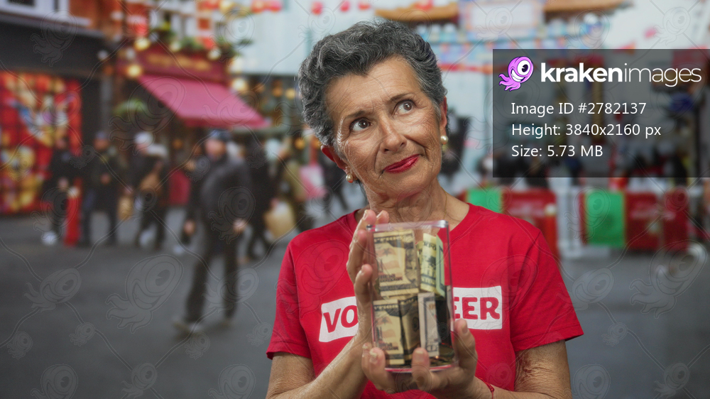 Woman volunteer with grey hair holds a jar of money outdoors on a busy urban street, wearing a red shirt, showcasing charity and community support.