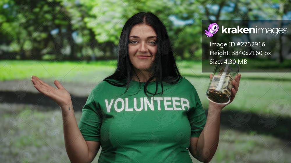 Woman volunteer holding dollar-filled jar with a smile in a sunny outdoor park setting