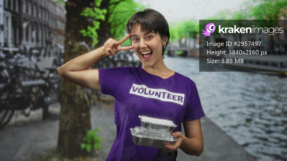 Woman volunteer holding foil food containers and making a peace sign to her face on a street; joy community service.