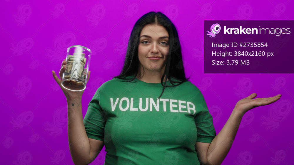 Woman volunteer holding jar of us dollars against a vibrant pink background, showcasing charity and fundraising efforts with a confident expression