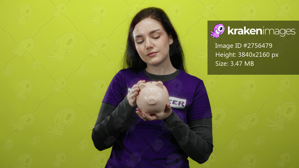 Woman volunteer holding piggybank against vibrant yellow background highlighting her brunette hair and purple shirt emphasizing charity and saving concept.