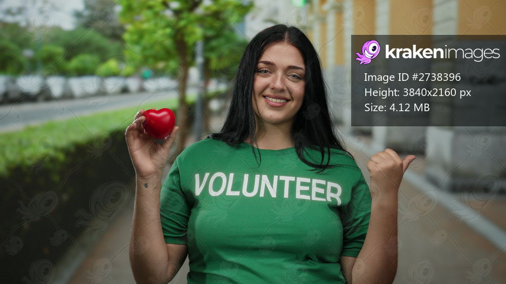 Woman volunteer holding red heart and pointing with thumb in outdoor city street setting showcasing youthful joy and community spirit
