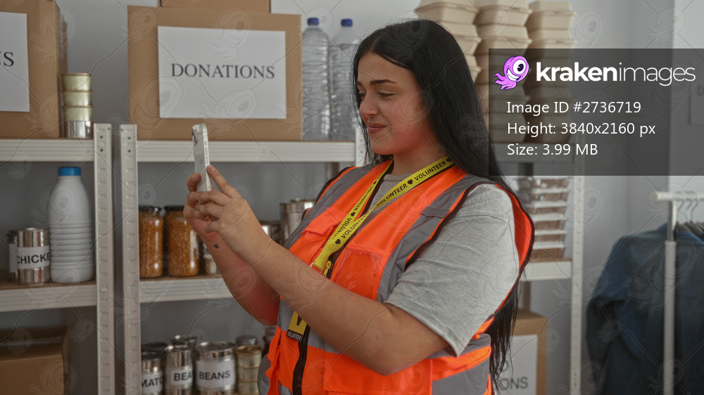 Woman volunteer in a charity center takes a photo with her phone surrounded by donation boxes and food supplies, reflecting a dedicated and supportive community environment. - Kraken Images
