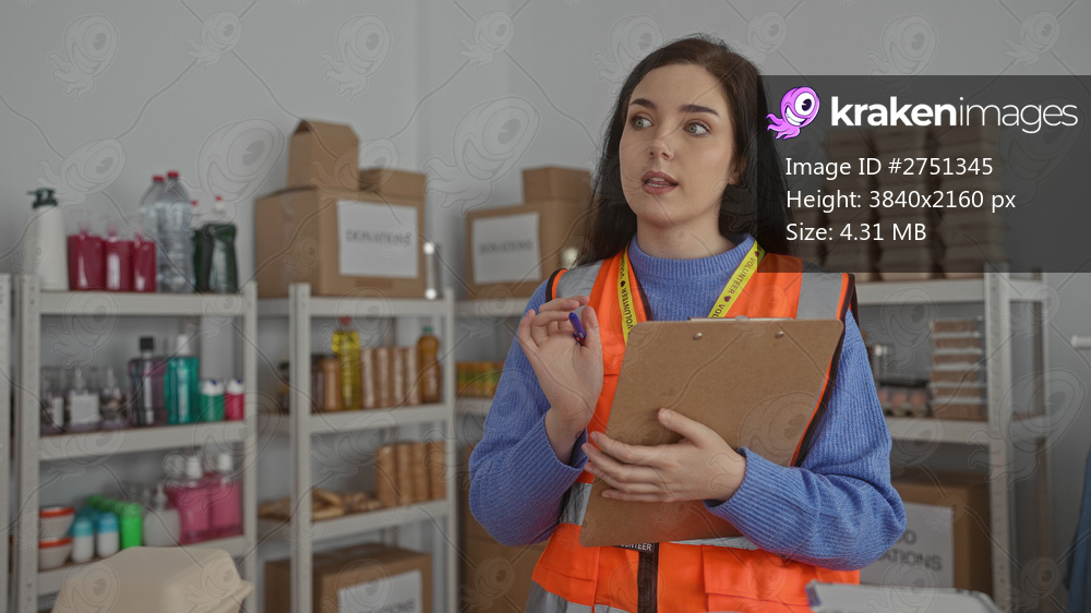 Woman volunteer in an orange vest holding a clipboard stands in a storage room surrounded by supplies, indicating instructions indoors for organized distribution efforts. - Kraken Images