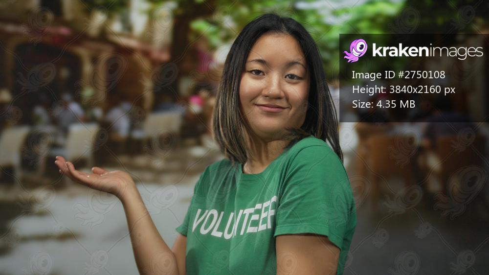Woman volunteer in green shirt gestures outdoors on a city street terrace restaurant with people in the background enjoying their coffee.