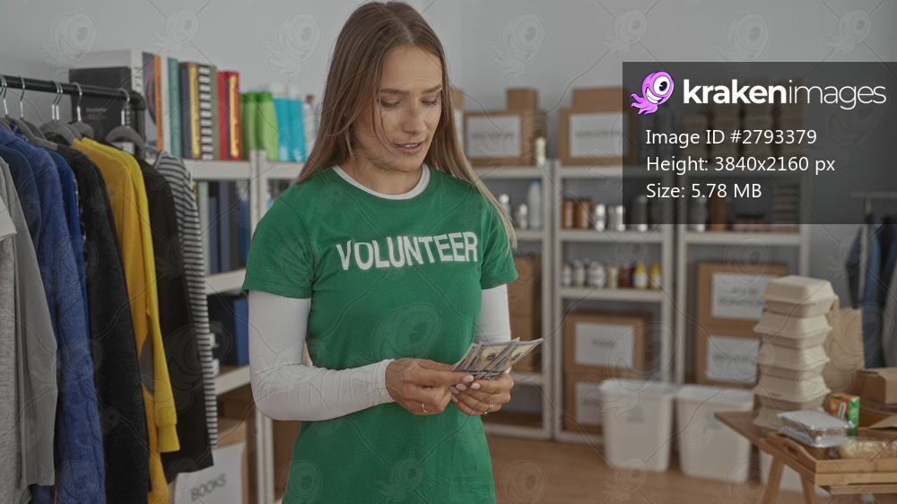 Woman volunteer in green shirt holding usd bills, standing in an indoor donation center with shelves and clothing, expressing concern over funds.