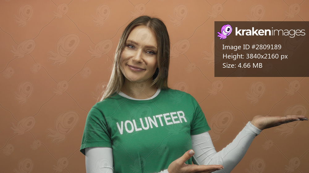 Woman volunteer in green shirt presenting with hands against brown wall highlighting cheerful assistance and community spirit.