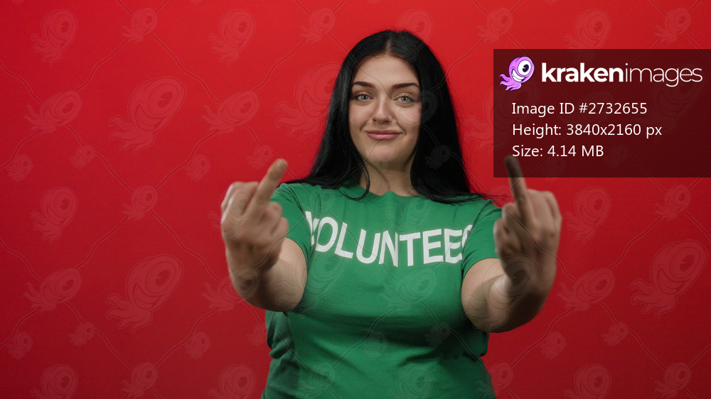 Woman volunteer in green shirt showing irreverent gesture on red background conveys attitude and confidence with a playful expression.