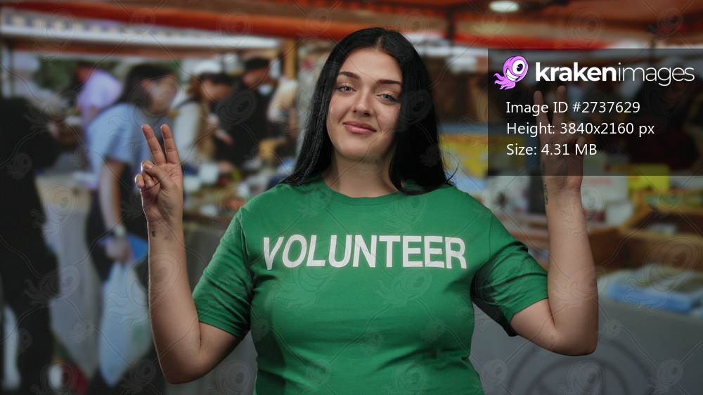 Woman volunteer in green shirt stands smiling at outdoor market with people in background showcasing a vibrant community atmosphere and diverse crowd participation. - Kraken Images