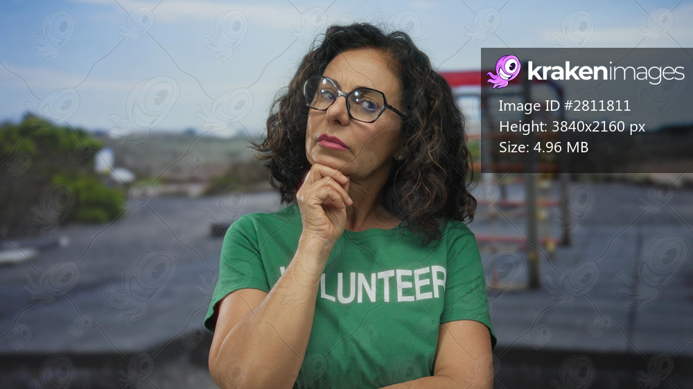 Woman volunteer in green shirt thinking outdoors with gym equipment in background.
