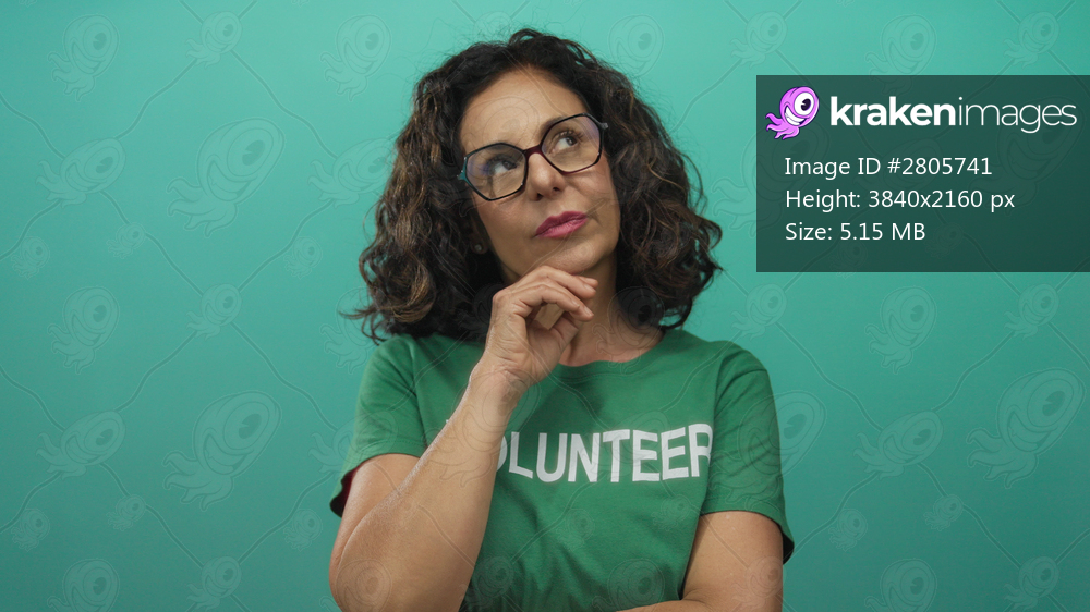 Woman volunteer in green shirt with thoughtful expression against isolated green background wall reflects contemplation and purpose.