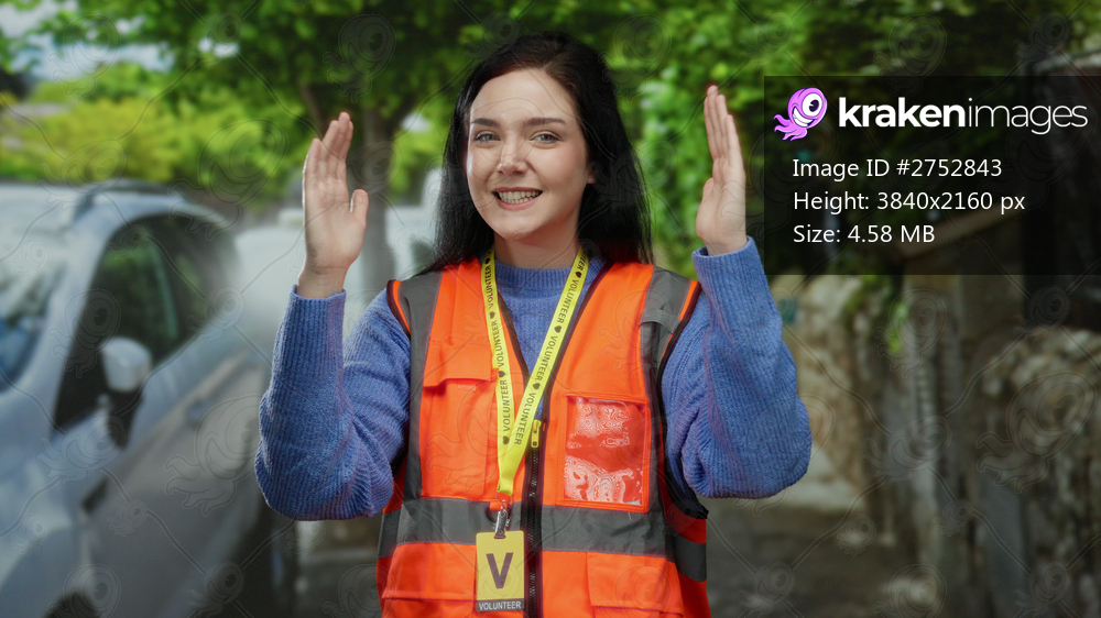 Woman volunteer in orange vest gestures on a sunny street in an old town setting with green trees, closed eyes, and focus, symbolizing calm and mindfulness. - Kraken Images