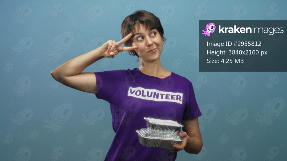 Woman volunteer in purple shirt holding foil food containers and making a peace sign by her eye in studio; community service joy.