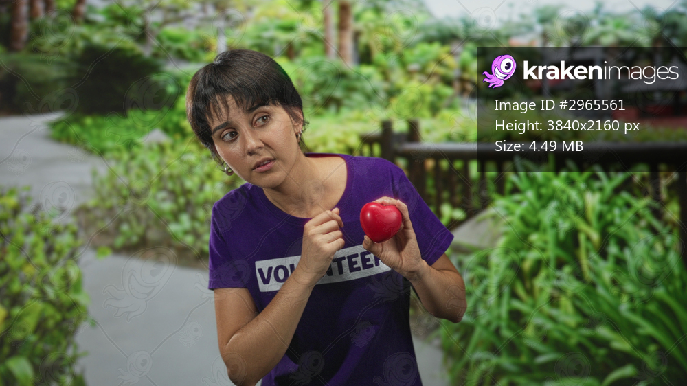 Woman volunteer in purple shirt holding red heart, hand to chin pensive pose on park path in forest; compassion reflection.