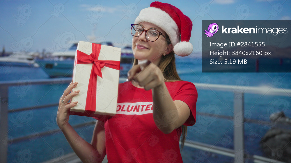 Woman volunteer in red santa hat smiling holds gift box and points finger on street; holiday joy and giving spirit.