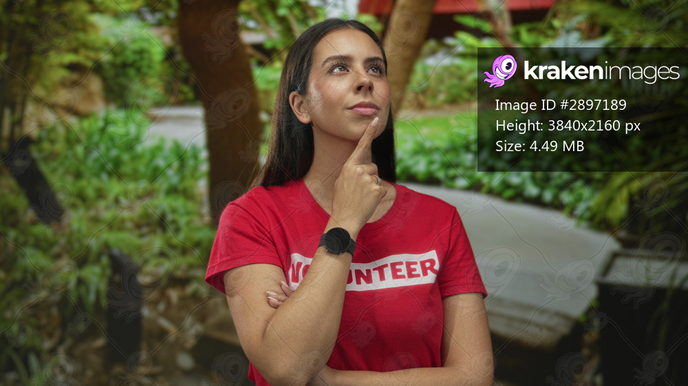 Woman volunteer in red shirt with finger to chin looking upward in forest path; thoughtful reflection.
