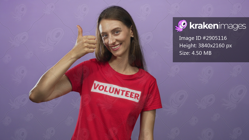 Woman volunteer in red shirt giving thumbs up in studio with purple backdrop; community support optimism.