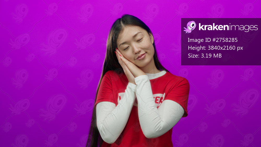 Woman volunteer in red shirt peacefully resting against vibrant pink isolated background with closed eyes exhibiting relaxation and contentment