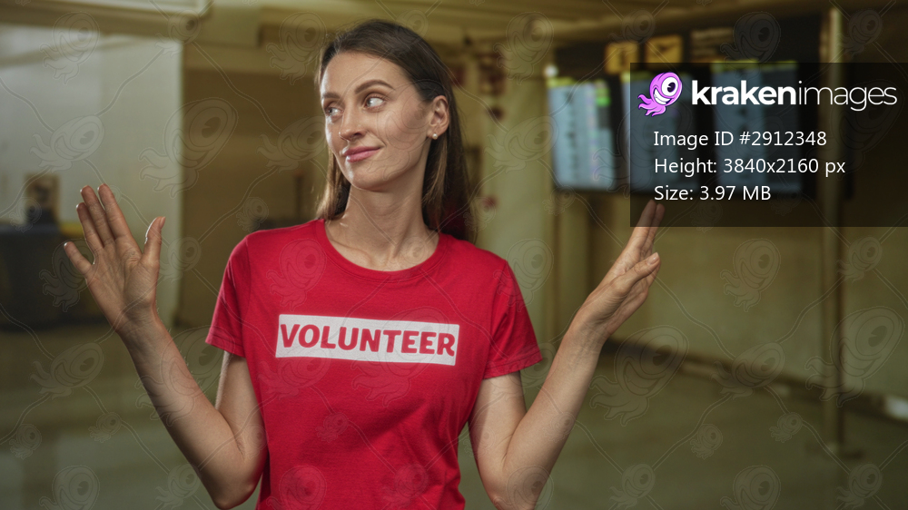 Woman volunteer in red tshirt with hands raised shrugging at airport terminal next to flight boards; helpful playful attitude.
