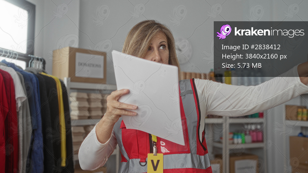 Woman volunteer in red vest holds list paper with finger pointing in building donation center; compassion.