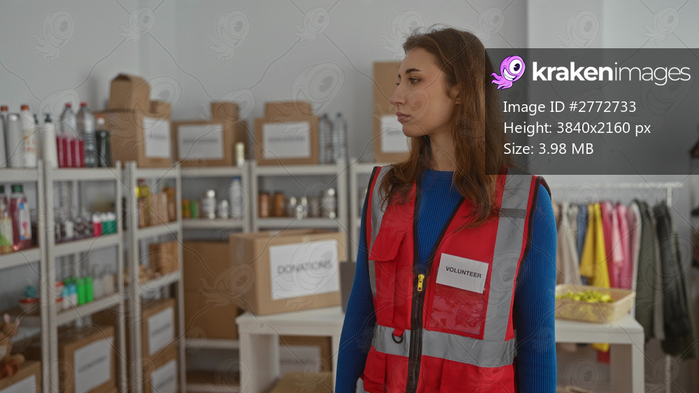 Woman volunteer in red vest oversees donation center filled with boxes and supplies, showcasing charity work environment.