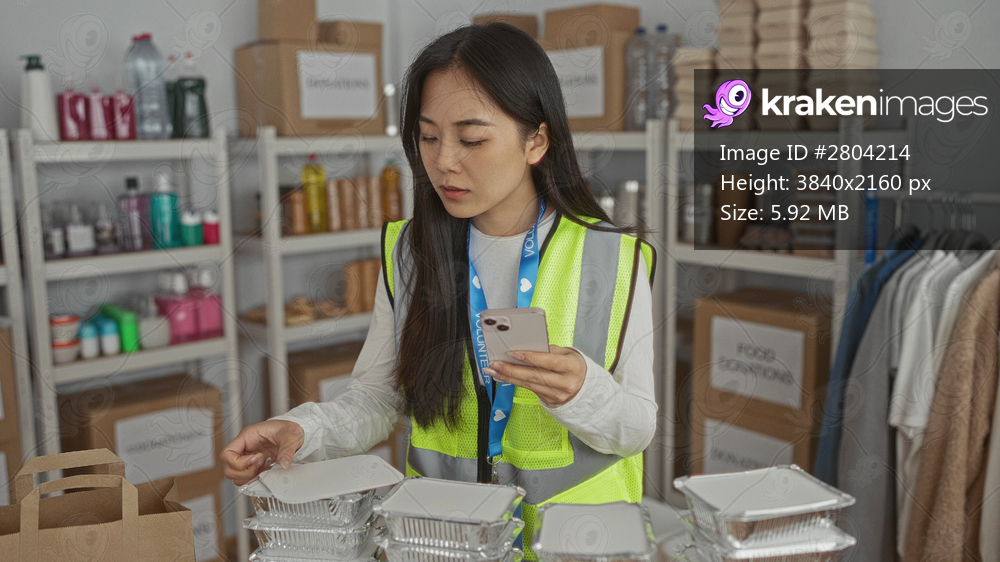 Woman volunteer in reflective vest organizing donations in charity center indoor with focus on packaging food and using smartphone.