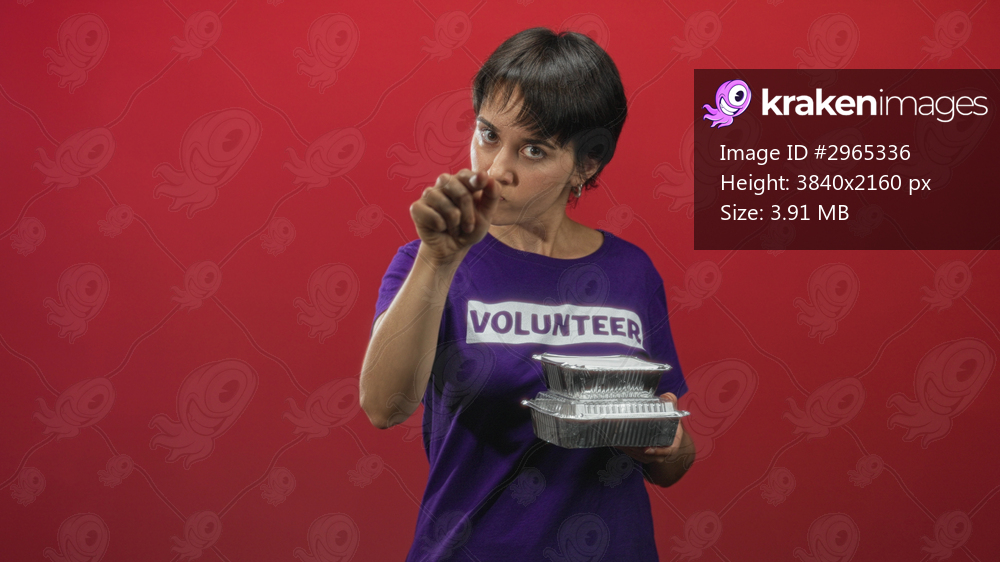 Woman volunteer in studio wearing purple volunteer shirt with short hair holding foil food containers pointing finger at camera; reprimand.