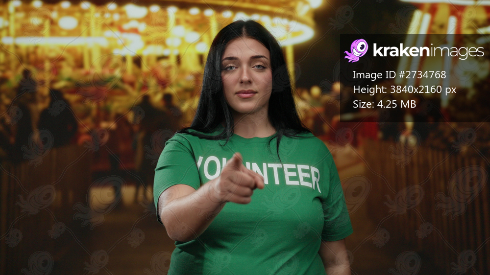 Woman volunteer making gesture at outdoor fair with bright lights and crowd, wearing green shirt, capturing curvy female empowerment and community spirit in festive setting. - Kraken Images