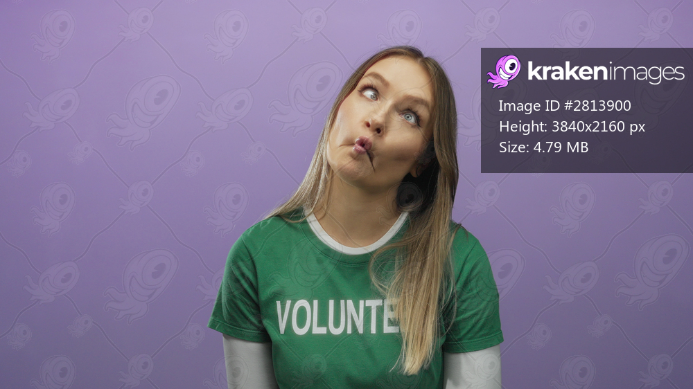 Woman volunteer making playful expression against purple background wearing green shirt with isolated setting.
