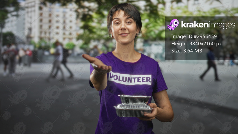 Woman volunteer offering a hand while holding stacked takeout containers on a busy street plaza with buildings and pedestrians nearby; compassion outreach. - Kraken Images