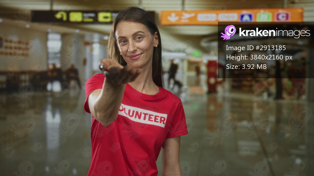 Woman volunteer offering outstretched hand in airport terminal wearing a red tshirt and smiling; friendly assistance.
