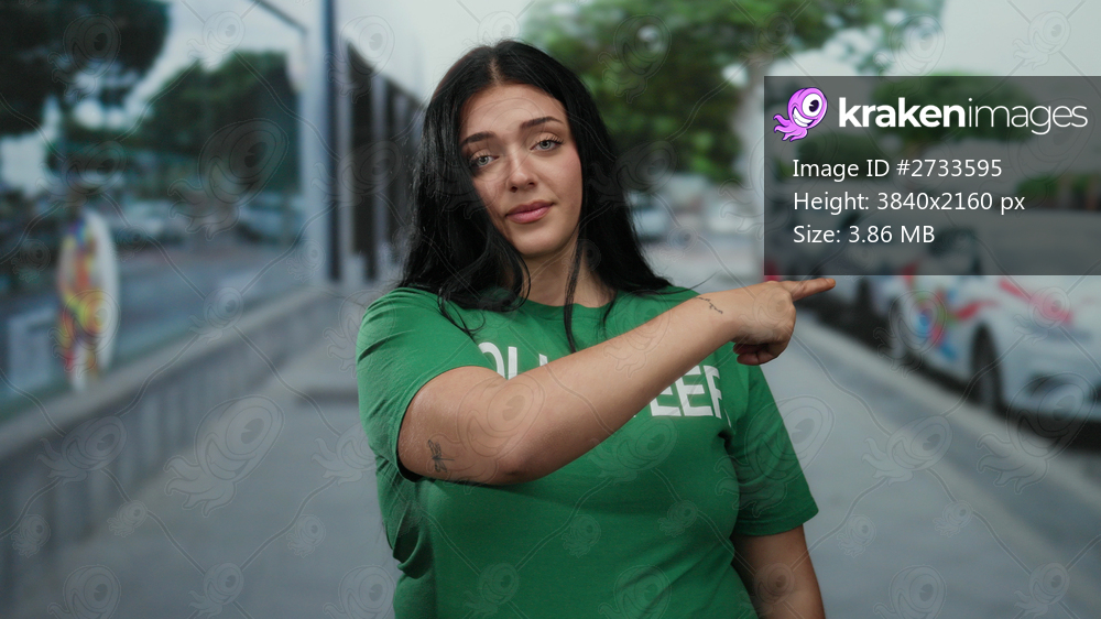 Woman volunteer outdoors gesturing on city street wearing green shirt pointing direction confidently urban scene