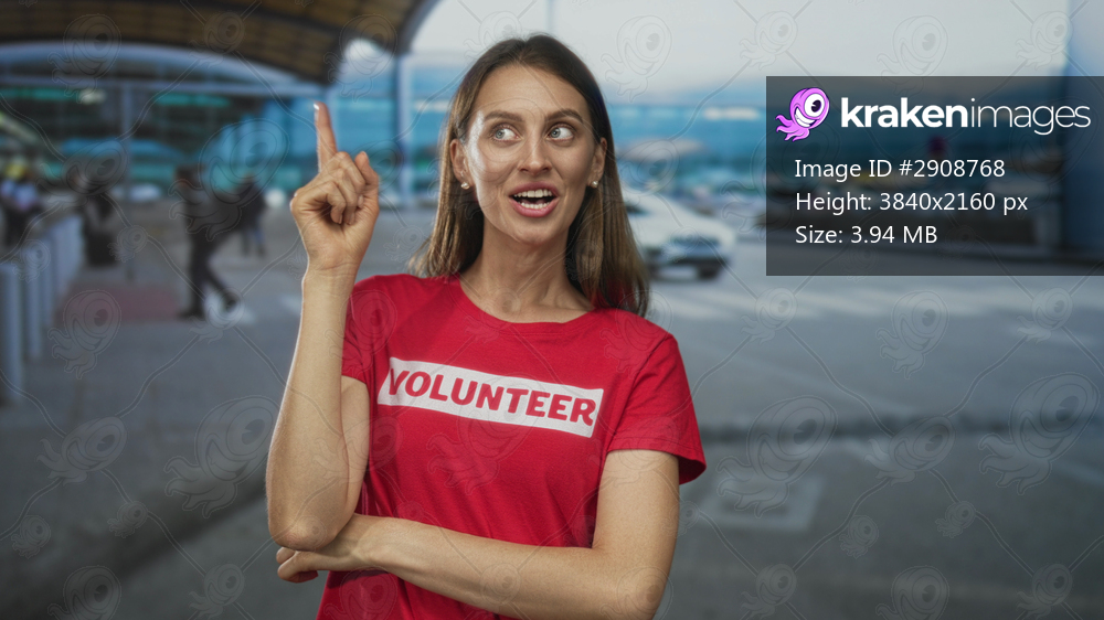Woman volunteer points finger upward at airport terminal with bare forearm visible and arms crossed at waist; community service welcoming.